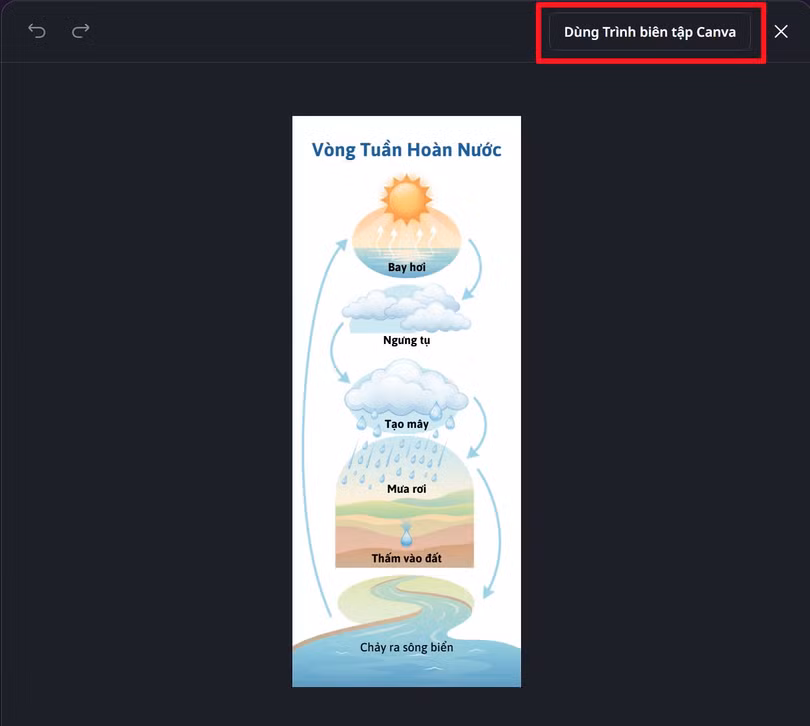 Tạo infographic về vòng tuần hoàn nước gồm các bước bay hơi, ngưng tụ, tạo mây và mưa rơi. Thiết kế theo phong cách giáo dục, màu sắc sinh động, có biểu tượng minh họa cho từng giai đoạn, bố cục rõ ràng dễ hiểu cho học sinh.
