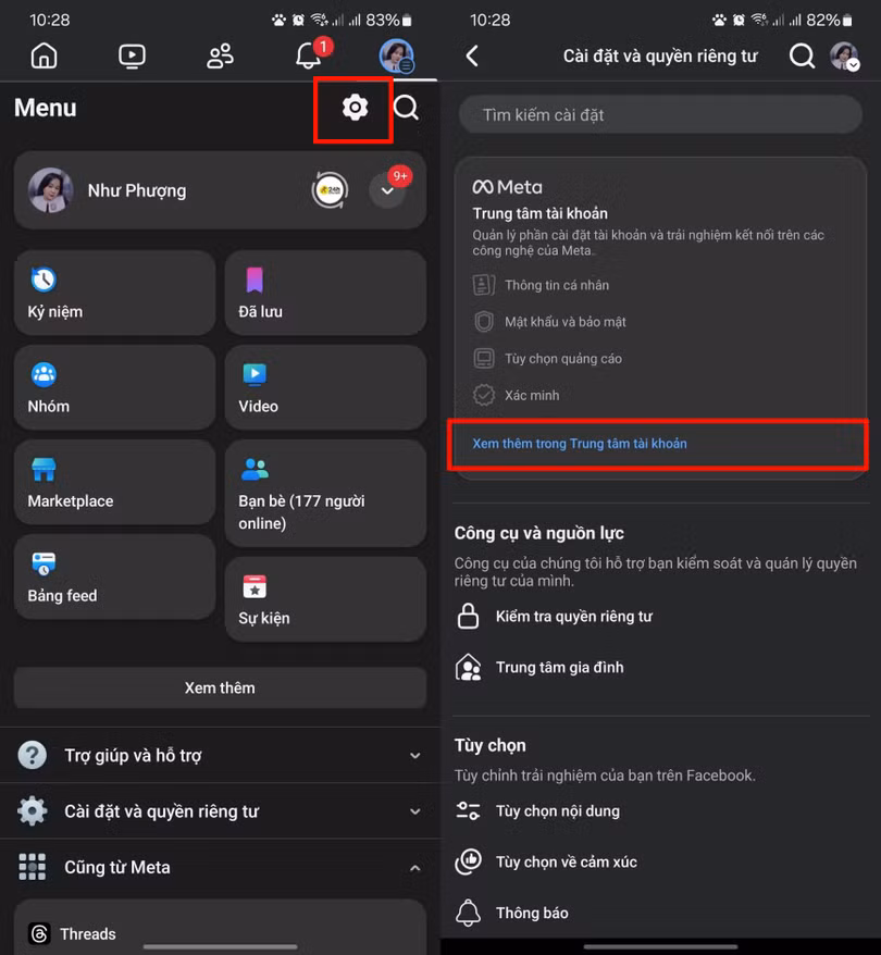 Bước 1: Nhấn vào biểu tượng Cài đặt trên ứng dụng Facebook > Kéo xuống và chọn mục .