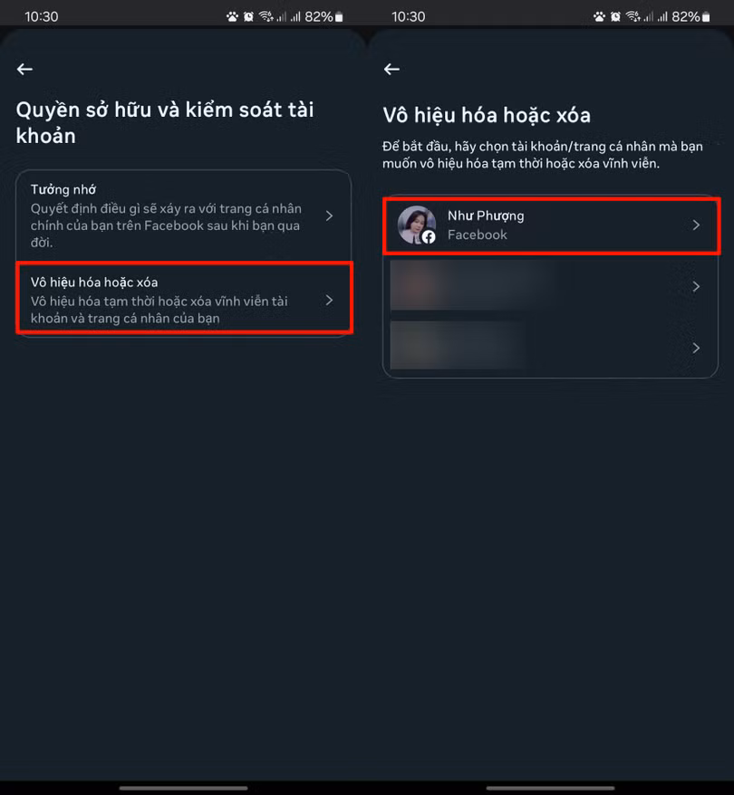 Bước 3: Nhấn vào mục Vô hiệu hóa hoặc xóa > Chọn đúng tài khoản Facebook mà bạn muốn vô hiệu hóa.