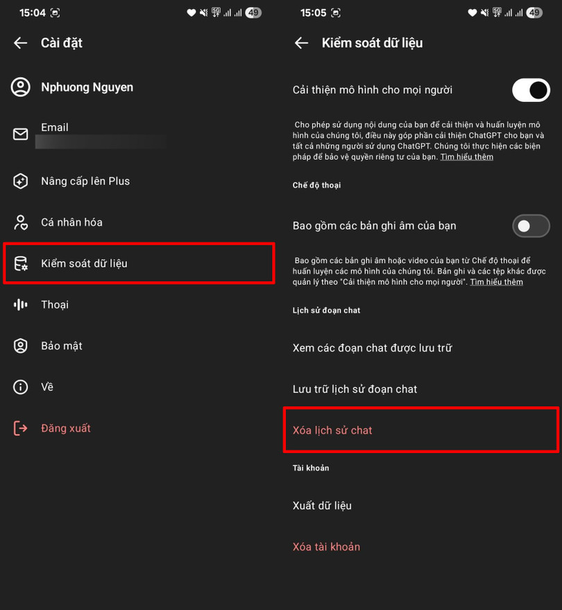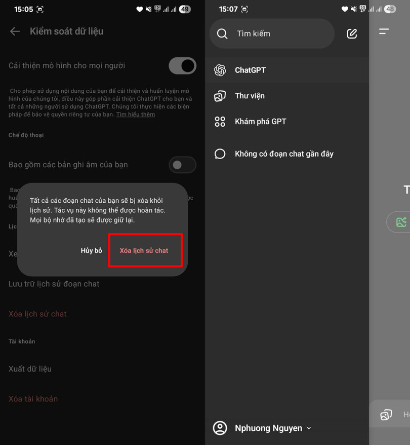 2. Cách xóa tất cả lịch sử chat trên ChatGPT trên điện thoại