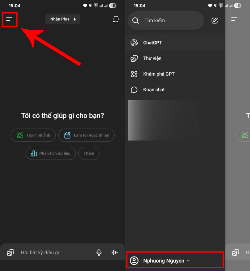 Bước 1: Nhấn vào biểu tượng hai gạch ngang ở góc trên bên trái giao diện ChatGPT để mở menu bên > Sau đó chọn vào tên tài khoản của bạn để truy cập các cài đặt cá nhân.