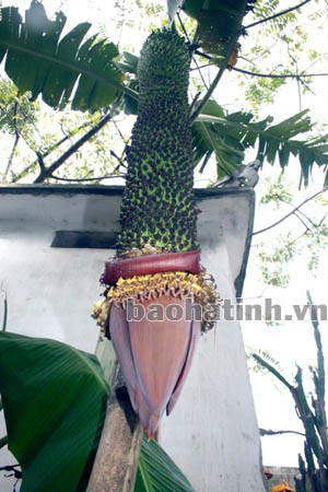 Tại khu vườn nhà anh Lê Văn Sơn ở thôn 10, xã Cẩm Quan, Cẩm Xuyên, Hà Tĩnh có một cây chuối trổ buồng với hàng trăm nải quả.
