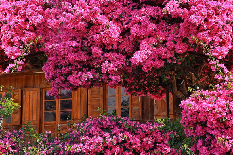 Hoa giấy được trồng phổ biến ở các tỉnh phía Nam nhờ đặc tính dễ trồng và có sức sống dẻo dai. Cây ở nhà chị Hiền cũng tương tự. "Hoa giấy dễ sống và chăm sóc. Tôi chỉ cần cắt tỉa cho đẹp thêm", chị nói. Một số nơi ở Đà Lạt cũng có cây hoa giấy đẹp như thác Hang Cọp. Song, cây ở đèo D'ran thu hút khách bậc nhất nhờ hoa mọc chi chít, tần suất dày, ít lá và đặc biệt là dáng cây mềm mại. Ngoài ra, căn nhà gỗ phía sau khi kết hợp với nhánh hoa giấy cũng tạo nên khung cảnh nên thơ. Khi được Znews hỏi về căn nhà này, chị Hiền cho biết căn nhà gỗ phía sau có trước, sau đó người bố mới trồng thêm cây hoa giấy trước hiên.
