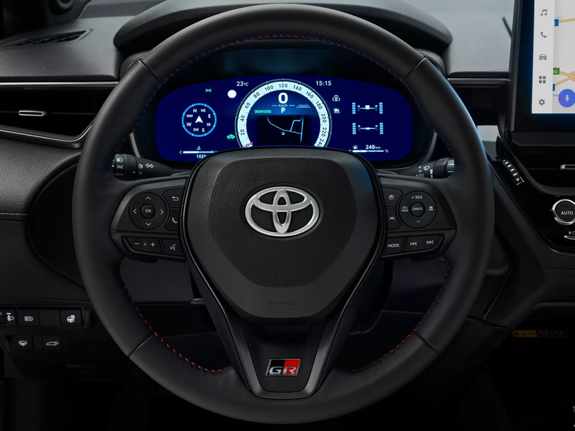 Đối với đời xe 2026, Toyota đã tinh chỉnh một số chi tiết trên mẫu SUV hạng B Corolla Cross. Đặc biệt, hãng cũng bổ sung phiên bản thể thao Toyota Corolla Cross GR SPORT tại thị trường châu Âu với phong cách năng động hơn. Đây là lần đầu tiên Toyota Corolla Cross nhận được gói thiết kế GR SPORT tại châu Âu. Tuy nhiên, đây chỉ là phiên bản nâng cấp nhẹ về ngoại hình và nội thất, cũng như bổ sung một số tính năng vận hành cơ bản. Về ngoại hình, Toyota Corolla Cross GR SPORT 2026 sở hữu thiết kế lưới tản nhiệt tổ ong cỡ lớn sơn đen và hốc gió cản trước thể thao. Logo GR cũng được trang trí tại vị trí này. Cụm đèn trước LED được tinh chỉnh đồ họa bên trong với tính năng pha thích ứng. Đặc biệt, chi tiết này còn bổ sung vây gió giúp tối ưu khả năng khí động học. Mẫu SUV phong cách thể thao nhận được thiết kế mâm 5 chấu kép màu xám Storm Grey kích thước 19 inch. Chiều cao hệ thống treo cũng được hạ thấp 10 mm. Tương tự, cụm đèn hậu LED cũng sở hữu các vây gió nhằm ổn định luồng không khí di chuyển qua xe. Logo của phiên bản này được sơn tối màu mạnh mẽ hơn.