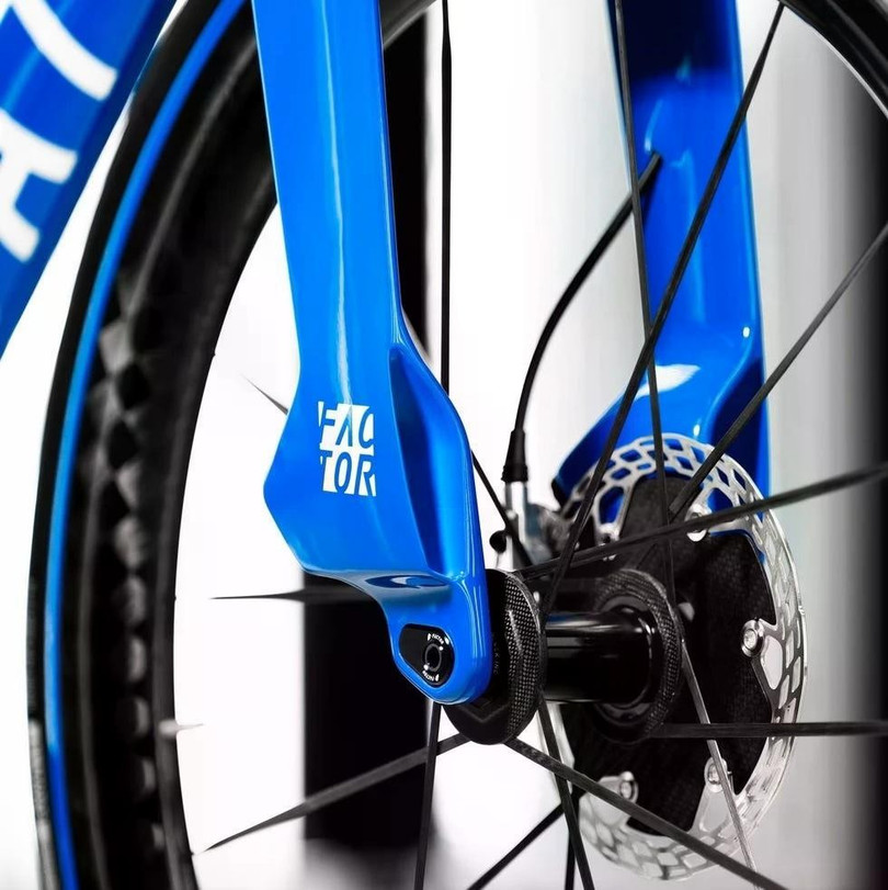 Xe đạp Bugatti Factor One được phủ lớp sơn màu xanh chính hãng Bugatti, các chi tiết sợi carbon lộ ra ngoài cùng biểu tượng chú voi nhảy múa đặc trưng. Hệ thống phanh bằng sợi carbon-titan, yên xe kiểu Italy và bộ lốp Continental được chế tác riêng.