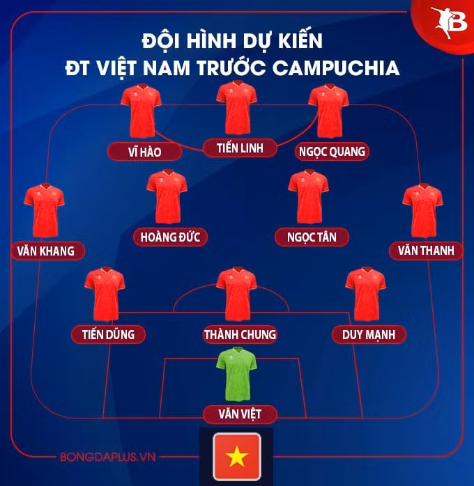Theo tìm hiểu, đây là bộ khung đã được HLV Kim Sang Sik tập luyện, thử nghiệm trong những buổi tập đối kháng những ngày qua. Tuy nhiên, trước giờ bóng lăn, ông thầy Hàn Quốc vẫn có thể xoay tua đội hình để phù hợp với hoàn cảnh và đối thủ Campuchia.