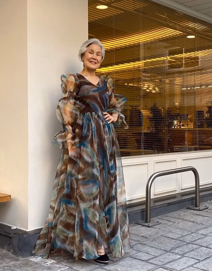 Bà diện đầm voan maxi tay bồng với giày đế xuồng khi đi cà phê cùng bạn bè năm 2020.