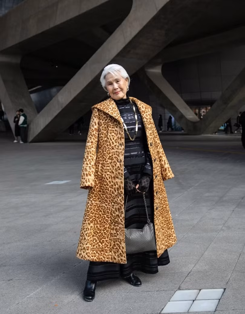 Choi Soon Hwa tạo ấn tượng bằng áo khoác da báo và bốt cao cổ khi dự Tuần lễ thời trang Seoul mùa mốt Thu Đông 2024.
