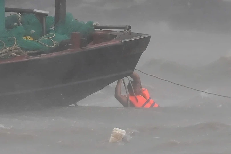 Khoảng 9h sáng 7/9, hàng loạt thuyền, ghe, nhà bè neo đậu ở cảng Cái Rồng (huyện Vân Đồn, Quảng Ninh) bị gió quật đắm. Một người cố cứu tài sản trên ghe cũng bị rơi xuống biển.