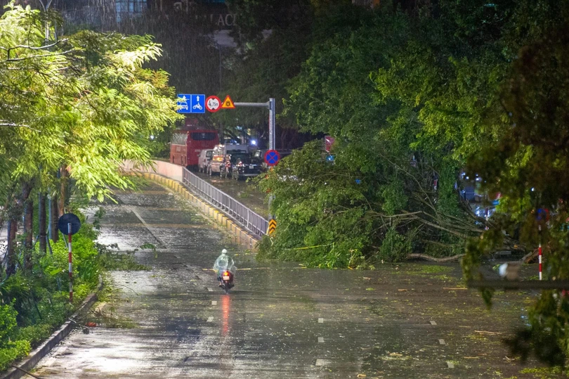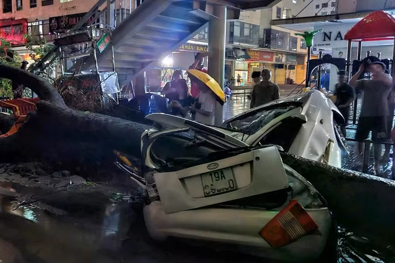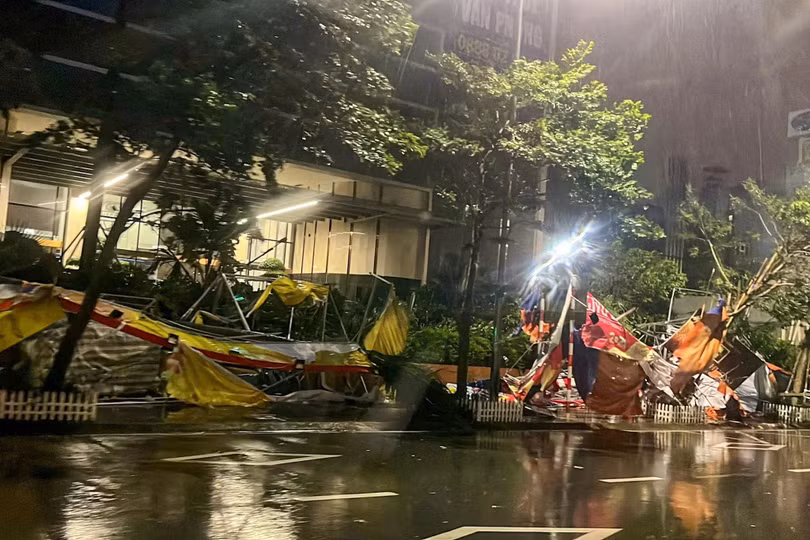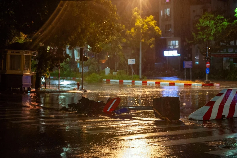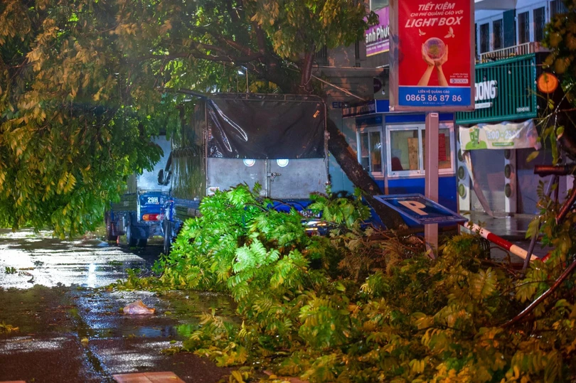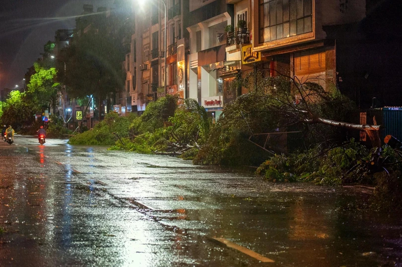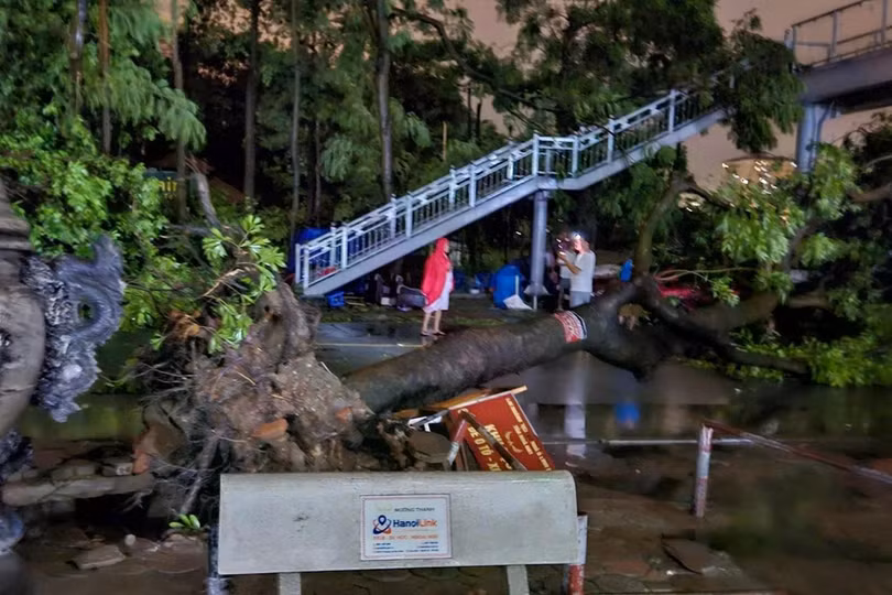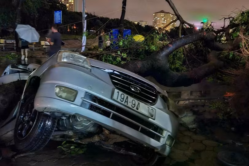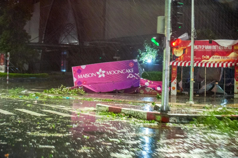 Đêm 7/8, sau khi bão YAGI đổ bộ vào Hà Nội với sức gió mạnh nhất cấp 9-10, giật cấp 12 đã để lại khung cảnh tan hoang. Biển quảng cáo, cột điện, cây cối, tôn nằm la liệt trên đường, nhiều xe cộ bị đè nát.