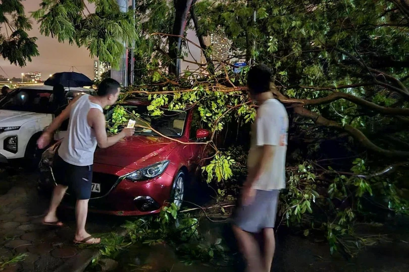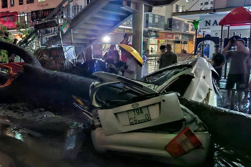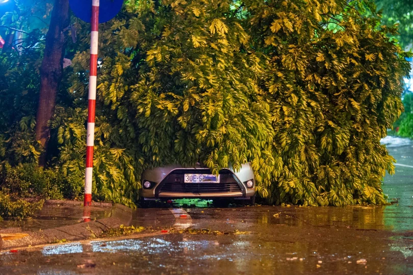 Hàng loạt ôtô bị cây cối gãy đổ đè lên tại các tuyến phố.