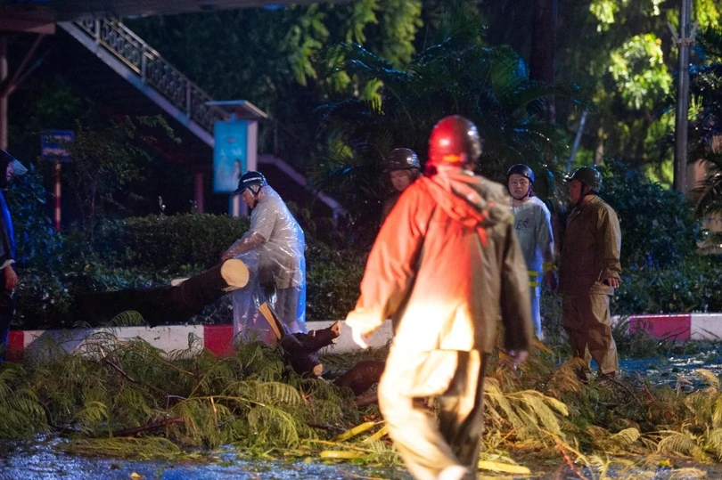 Lực lượng chức năng và nhân viên Công ty cây xanh Hà Nội dọn dẹp cây cối đổ ngã trên đường ngay trong đêm.
