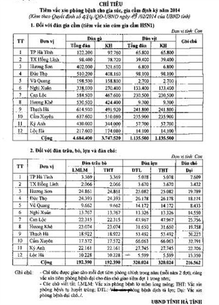 (Baohatinh.vn) - UBND tỉnh Hà Tĩnh vừa có quyết định về việc giao chỉ tiêu tiêm vắc xin phòng bệnh gia súc, gia cầm năm 2014 cho các huyện, thành, thị trong tỉnh.