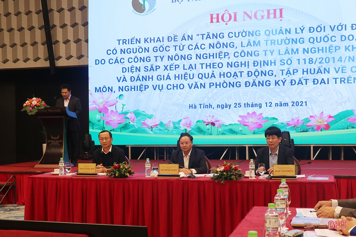 | Sáng 25/12, tại Hà Tĩnh, Thứ trưởng Bộ TN&MT Lê Minh Ngân, Phó Chủ tịch UBND tỉnh Hà Tĩnh Đặng Ngọc Sơn và Phó Tổng cục trưởng Tổng cục Quản lý đất đai Mai Văn Phấn chủ trì hội nghị triển khai Đề án “Tăng cường quản lý đối với đất đai có nguồn gốc từ các nông, lâm trường quốc doanh hiện do các công ty nông nghiệp, công ty lâm nghiệp không thuộc diện sắp xếp lại theo Nghị định số 118/2014/NĐ-CP, ban quản lý rừng và các tổ chức sự nghiệp khác, hộ gia đình, cá nhân sử dụng” (gọi tắt là đề án) và “Đánh giá hiệu quả hoạt động và tập huấn về chuyên môn, nghiệp vụ cho Văn phòng Đăng ký đất đai trên toàn quốc”. Hội nghị được kết nối trực tuyến tới 63 điểm cầu trên toàn quốc. |