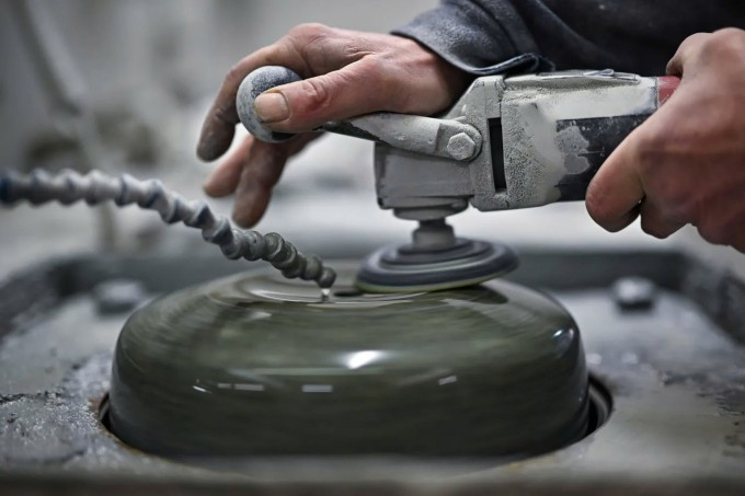 Tại xưởng ở Ayrshire, tảng đá được cắt thành từng tấm, đẽo gọt thành hình dạng thô "giống như một bánh phô mai", sau đó được mài bằng dụng cụ kim cương trên một chiếc máy tiện nặng 6 tấn từ thập niên 1960. Một đĩa đá xanh mài dày 20 mm được dán vào đáy khối đá bằng loại keo chuyên dụng dùng để gắn các bộ phận máy bay ở nhiệt độ dưới 0 độ C.