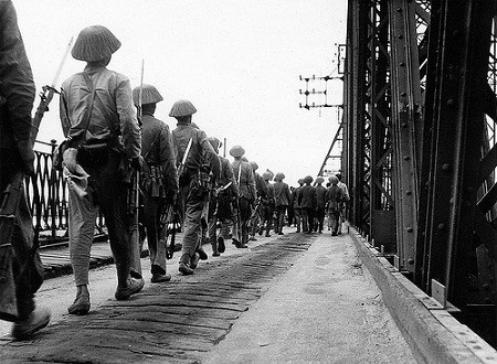 | Hình ảnh cầu Long Biên trong ngày giải phóng thủ đô Hà Nội năm 1954. |