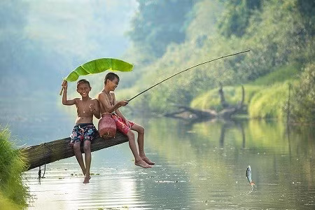 Hai cậu bé người Thái Lan ngồi câu cá trong trưa nắng hè.