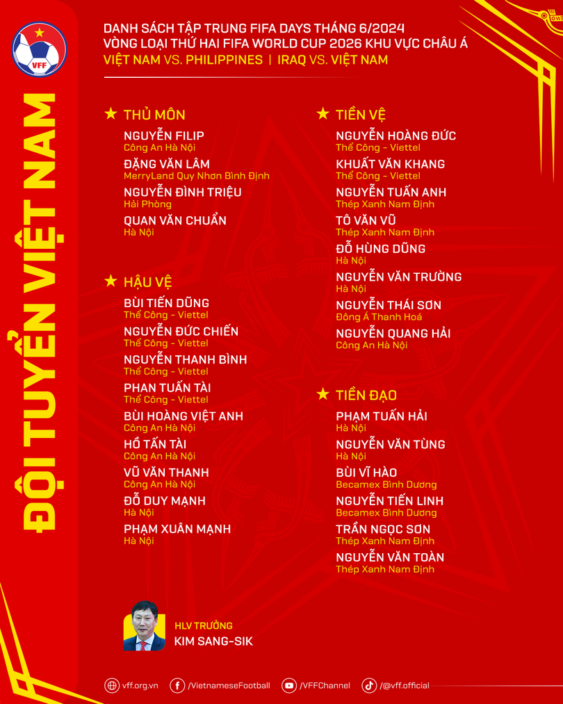 Chiều 27/5, HLV Kim Sang-sik chính thức công bố danh sách tuyển Việt Nam tập trung đợt FIFA Days tháng 6 với 27 cầu thủ.