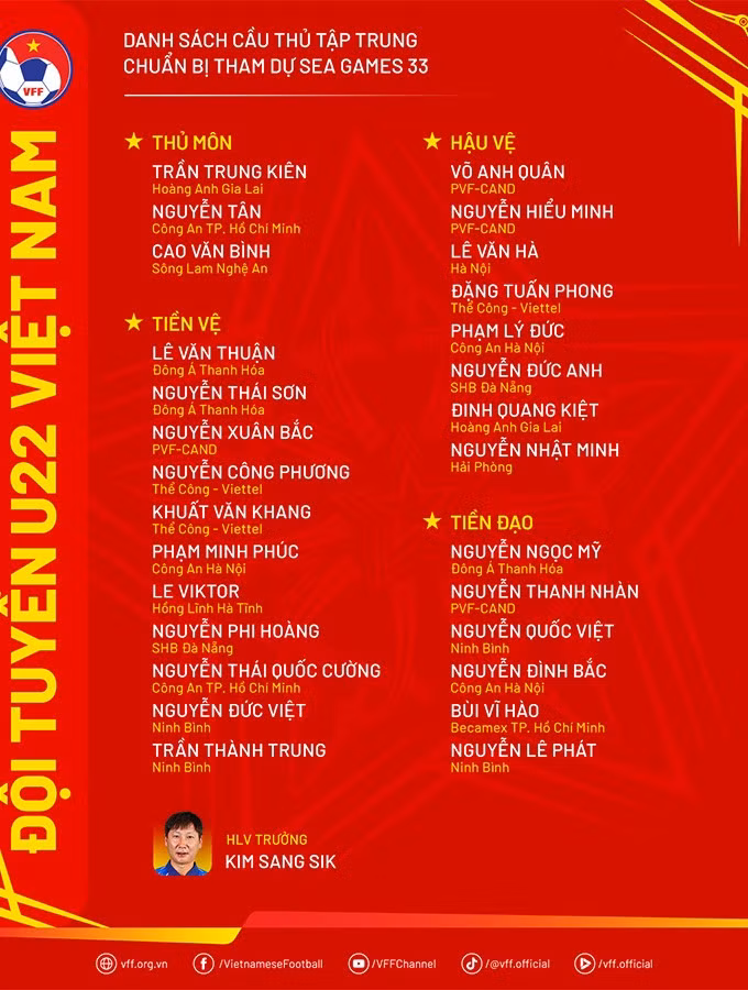 Một loạt những gương mặt quen thuộc như Trung Kiên, Nguyễn Hiểu Minh, Nguyễn Nhật Minh, Phạm Lý Đức, Nguyễn Phi Hoàng, Võ Anh Quân, Khuất Văn Khang, Nguyễn Xuân Bắc, Nguyễn Thái Sơn, Viktor Lê, Nguyễn Thanh Nhàn, Nguyễn Quốc Việt, Lê Văn Thuận, Nguyễn Đình Bắc… tiếp tục góp mặt. Tuy nhiên, tổn thất lớn nhất đối với U22 Việt Nam ở chiến dịch SEA Games 33 là sự vắng mặt của tiền vệ Nguyễn Văn Trường. Cầu thủ của Hà Nội không may dính chấn thương đứt dây chằng ở giải tập huấn Panda Cup, qua đó lỡ hẹn với giải đấu trên đất Thái Lan sắp tới.