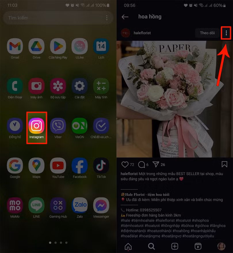 Bước 1:Mở ứng dụng Instagram trên điện thoại bạn lên > Nhấn chọn vào một hình ảnh bất kỳ mà bạn muốn tải về điện thoại > Chọn vào biểu tượng dấu 3 chấm như hình.