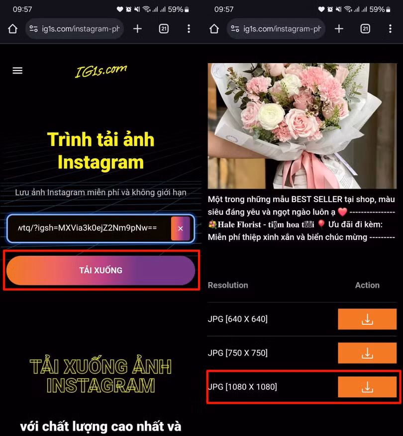 Bước 4: Dán link ảnh vừa sao chép về vào khung > Nhấn chọn vào mục Tải ảnh. Lúc này IG1S sẽ đưa ra nhiều lựa chọn, nếu bạn muốn ảnh chất lượng tốt nhất thì hãy chọn thông số cao nhất để tải là được nha.