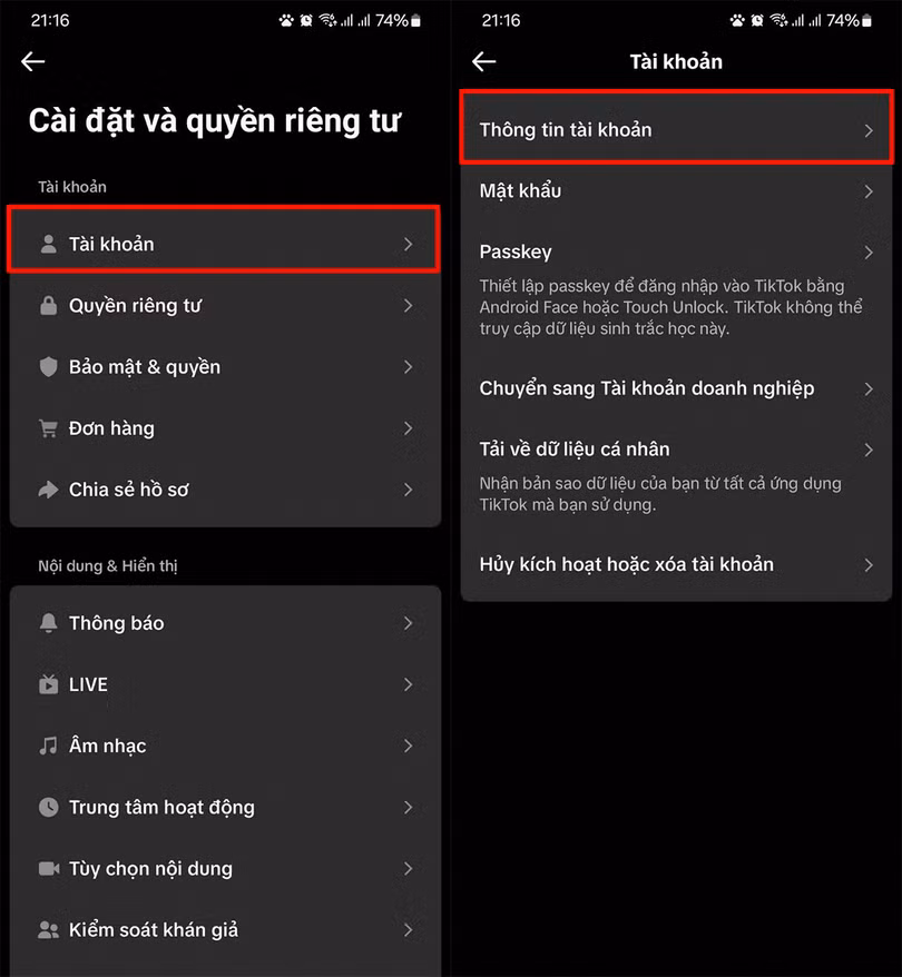 Bước 2: Nhấn chọn tiếp vào mục Tài khoản > Chọn vào mục Thông tin tài khoản để tiến hành xác thực tài khoản TikTok nha.