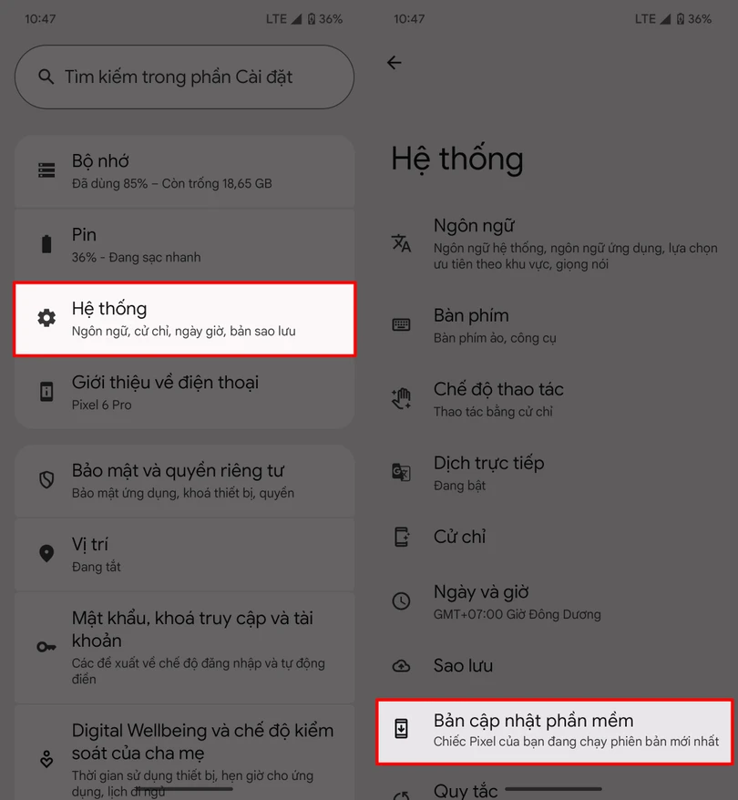 Bước 1: Mở ứng dụng Cài đặt trên điện thoại của bạn lên > Nhấn chọn vào mục Hệ thống > Nhấn chọn tiếp vào mục Bản cập nhật phần mềm.