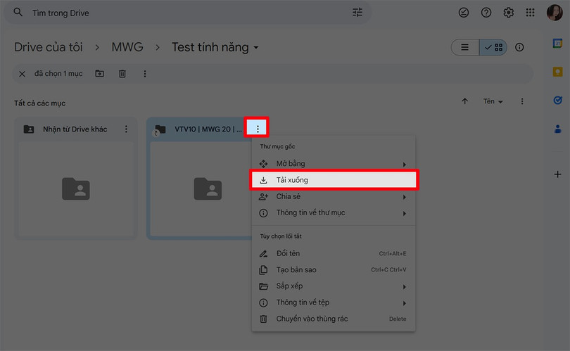 Bước 3: Mở Dirve của mình lên, tìm đến thư mục mà bạn vừa thêm lối tắt của Tệp bên trên. Nhấn vào dấu 3 chấm bên cạnh thư mục > Chọn vào mục Tải về để có thể tải toàn bộ file trong Dirve đó về là xong.