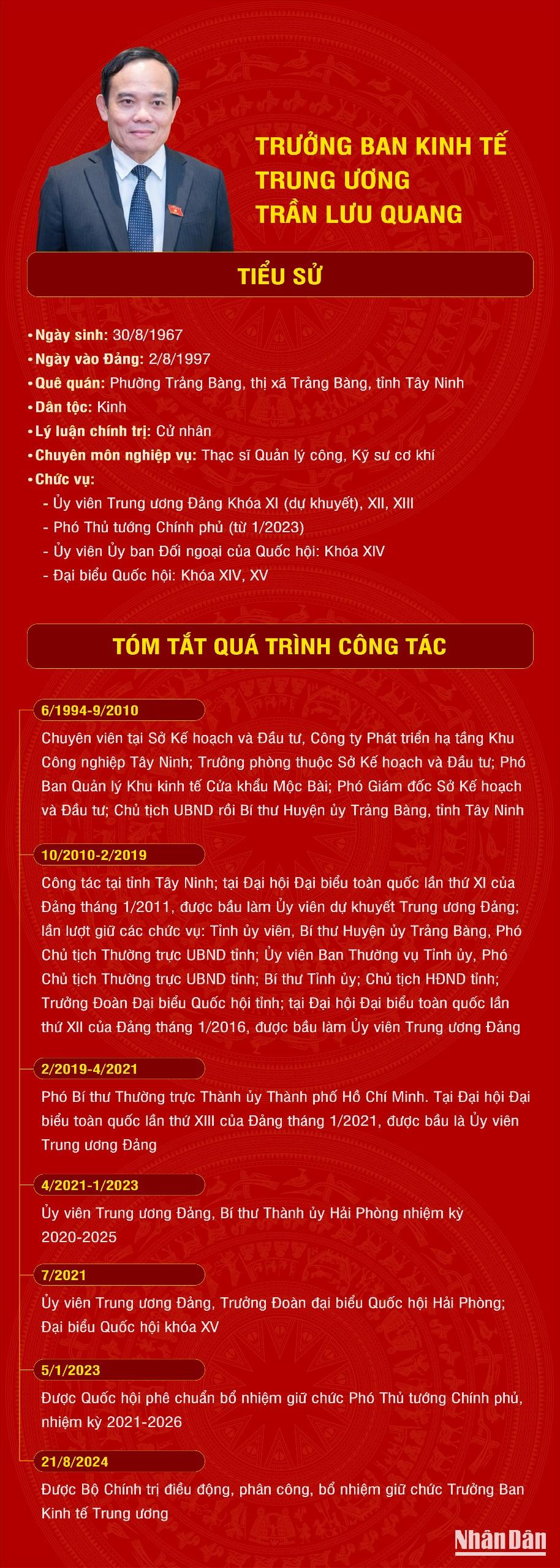 Tại Quyết định số 1488-QĐNS/TW ngày 16/8/2024, Bộ Chính trị quyết định, đồng chí Trần Lưu Quang, Ủy viên Trung ương Đảng, Ủy viên Ban Cán sự đảng Chính phủ, Phó Thủ tướng Chính phủ thôi giữ chức Ủy viên Ban Cán sự đảng Chính phủ, điều động, phân công, bổ nhiệm giữ chức Trưởng ban Kinh tế Trung ương.