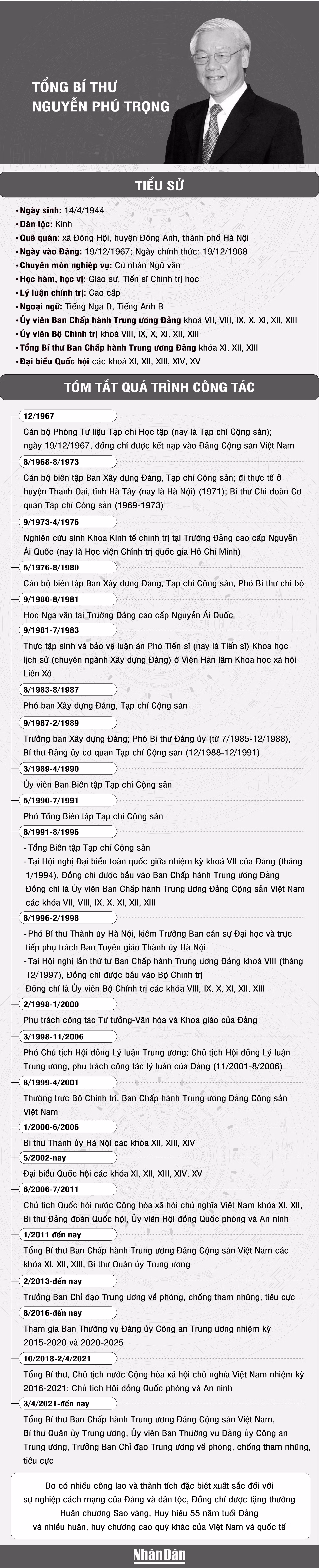 Theo thông tin từ Hội đồng chuyên môn bảo vệ sức khỏe cán bộ Trung ương, đồng chí Tổng Bí thư Nguyễn Phú Trọng, sau thời gian lâm bệnh, mặc dù được Đảng, Nhà nước, tập thể các giáo sư, bác sĩ tận tình cứu chữa, gia đình hết lòng chăm sóc, nhưng do tuổi cao, bệnh nặng, đồng chí đã từ trần lúc 13 giờ 38 phút, ngày 19/7/2024 tại Bệnh viện Trung ương Quân đội 108, hưởng thọ 80 tuổi.