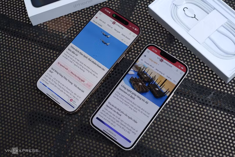 Màn hình của iPhone 16 Pro Max (trái) sáng và nét hơn iPhone 16e. Nếu đã quen sử dụng màn hình tần số quét 120 Hz trở lên, khi mới trải nghiệm iPhone 16e sẽ có cảm giác "lag" nhẹ, thao tác chuyển khung hình kém mượt dù cấu hình máy mạnh.