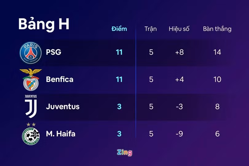 Lần đầu tiên sau 8 năm, Juventus phải dừng chân từ vòng bảng Champions League. Thua Benfica, họ chỉ có 3 điểm sau 5 lượt trận, kém hai vị trí dẫn đầu của PSG và Benfica 8 điểm khi vòng bảng còn một lượt trận. Thậm chí, CLB thành Turin còn đứng trước nguy cơ vắng mặt ở mọi giải đấu cúp châu Âu mùa này. Ở lượt trận cuối, thầy trò Max Allegri phải giành kết quả thuận lợi trước PSG mới có cơ hội giữ được vị trí thứ 3, đồng nghĩa với vé xuống chơi tại Europa League.