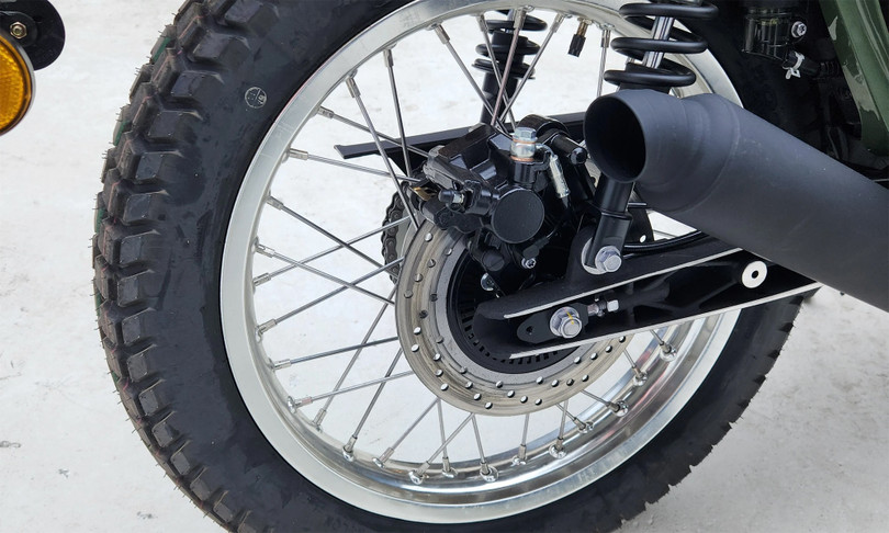 Mẫu hai bánh của thương hiệu Trung Quốc sử dụng vành nan hoa 17 inch đi kèm cặp lốp địa hình. Ống xả đặt cao.