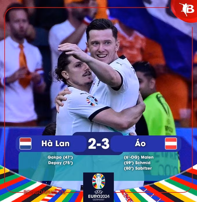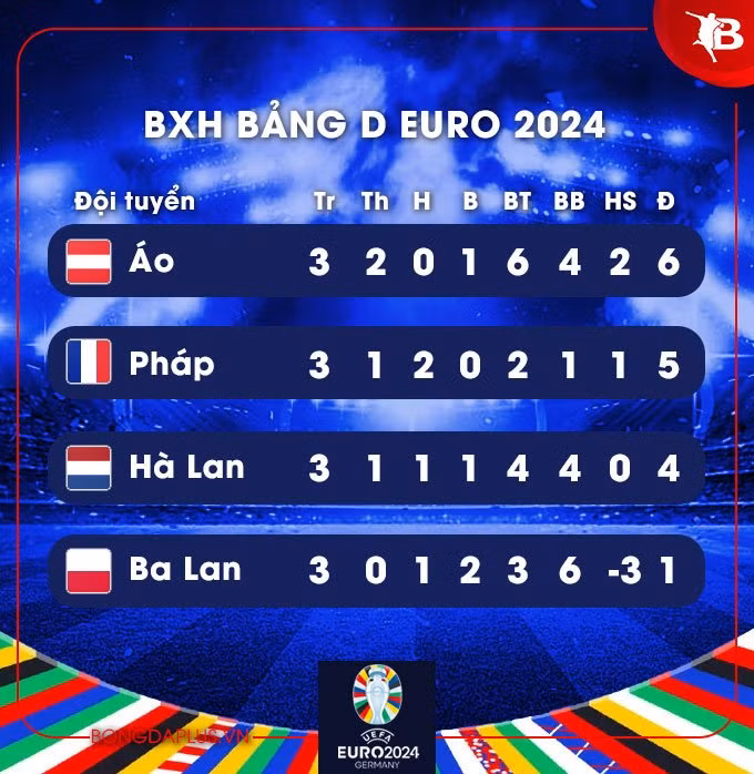 Thắng 3-2 trước Hà Lan trong khi Pháp bị Ba Lan cầm chân 1-1, Áo đã bất ngờ đoạt ngôi nhất bảng D và sẽ gặp đội nhì bảng F, bảng đấu mà Thổ Nhĩ Kỳ, Georgia và CH Séc đang cạnh tranh ngôi nhì.