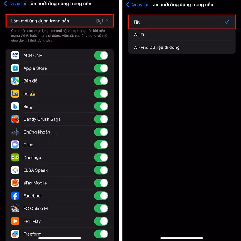 Bước 2: Chọn tiếp Làm mới ứng dụng trong nền > Tại đây bạn chọn Tắt để hệ thống tiết kiệm được pin hơn cho thiết bị của mình nhé.
