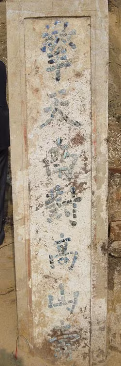 Đôi câu đối bằng chữ Hán mặt trước cột nanh phát lộ tại di tích.