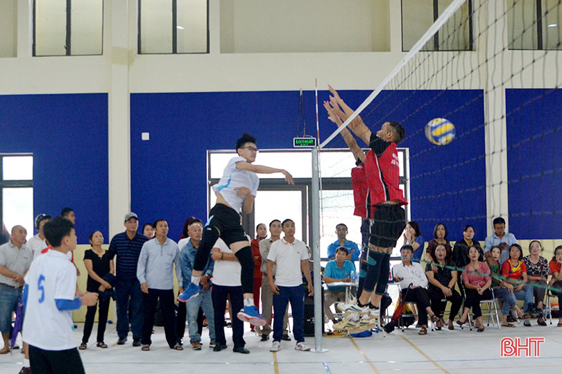 Các trận đấu Giải Bóng chuyền nam diễn ra tại Nhà đa năng của trường THCS Bắc Hồng. (Trong ảnh: Với sức trẻ, lối tấn công đa dạng giữa đội xã Thuận Lộc và Trường THPT Hồng Lĩnh đã cho khán giả xem trận đấu đẹp mắt)