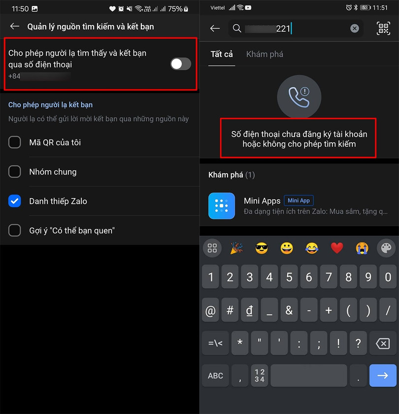 Lúc này, nếu người khác tìm kiếm số điện thoại của bạn trên Zalo, trên màn hình của người đó sẽ hiển thị dòng chữ "Số điện thoại chưa đăng ký tài khoản hoặc không cho phép tìm kiếm Zalo".
