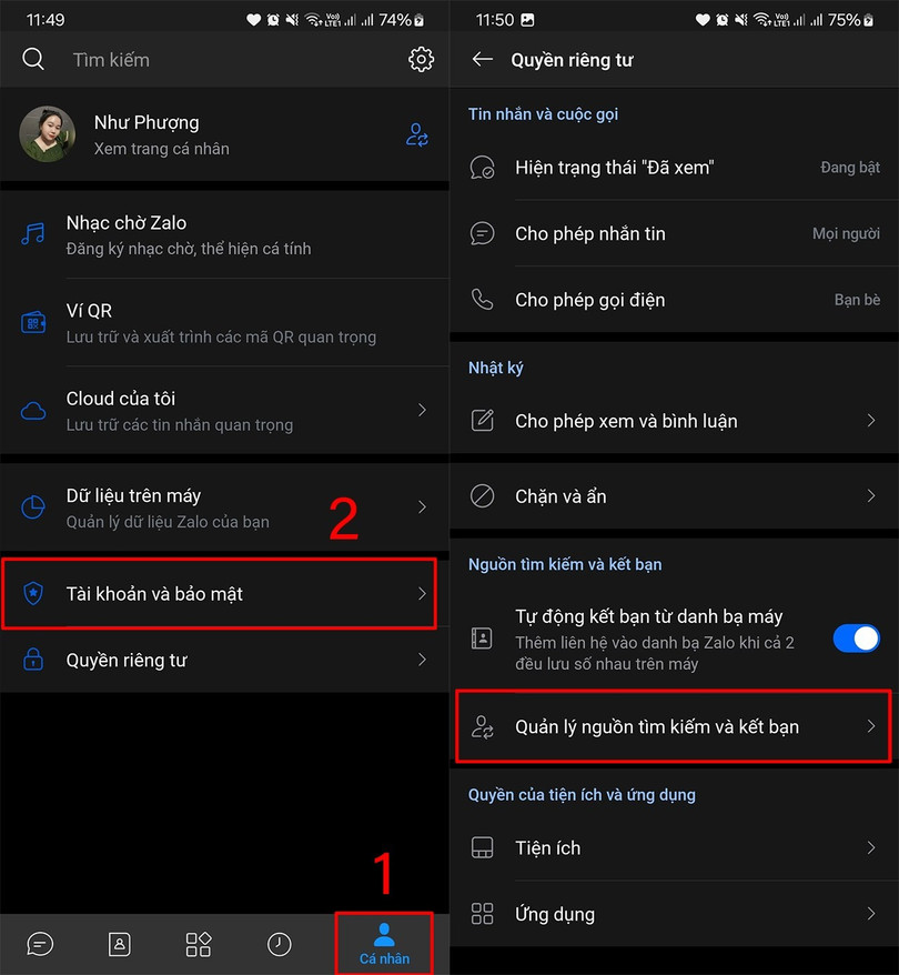 Bước 1: Mở ứng dụng Zalo trên điện thoại bạn lên > Nhấn vào mục Cá nhân bên góc phải màn hình > Nhấn chọn mục Quyền riêng tư > Chọn tiếp vào mục Quản lý nguồn kết bạn.