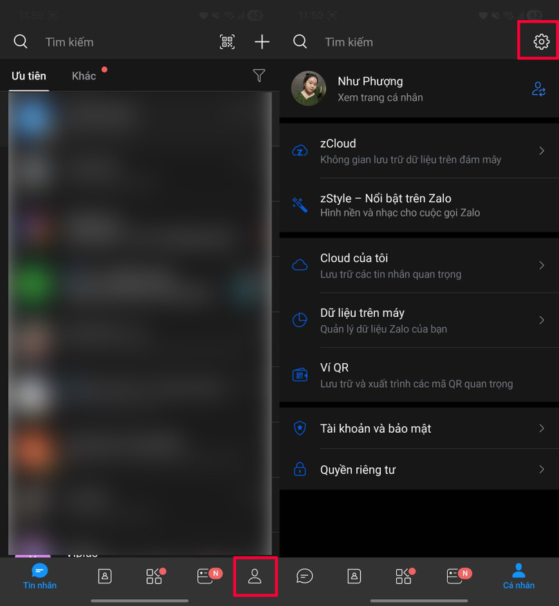 Bước 1: Mở Zalo lên > Nhấn chọn vào biểu tượng Trang cá nhân > Chọn tiếp vào biểu tượng Cài đặt.