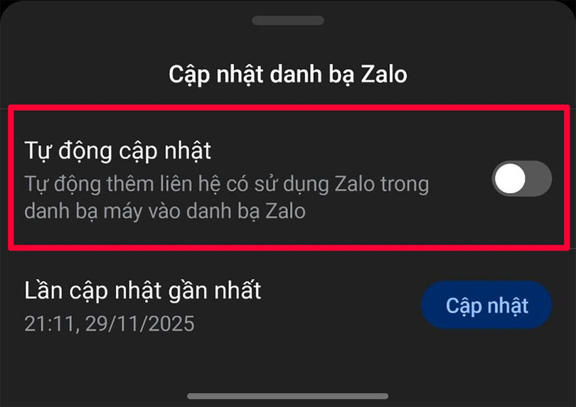 Bước 3: Tắt tính năng Tự động cập nhật để Zalo không tự lấy danh bạ và đề xuất kết bạn nữa.