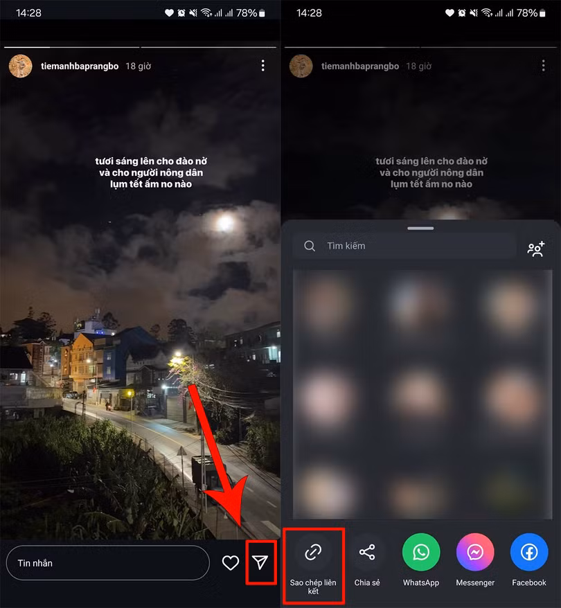 Bước 1:Mở ứng dụng Instagram lên > Chọn vào một Story bất kỳ mà bạn muốn tải về > Nhấn Chia sẻ để tiến hành Sao chép liên kết của Story.