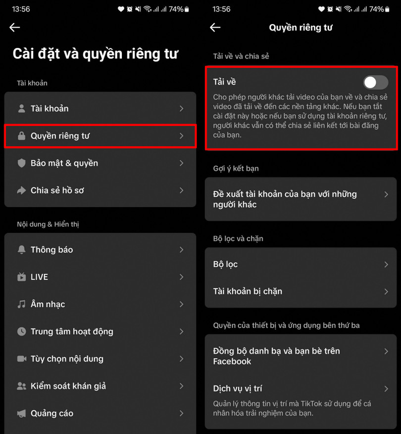 Bước 2: Nhấn chọn vào mục Quyền riêng tư > Kéo xuống phía dưới bạn sẽ thấy mục Tải về, lúc này bạn hãy Gạt tắt tính năng này đi là xong.