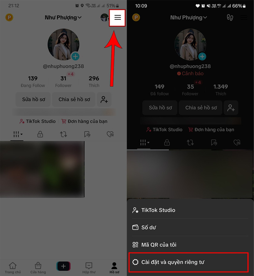 Bước 1: Mở ứng dụng TikTok trên điện thoại của bạn lên > Lúc này bạn hãy nhấn chọn vào biểu tượng 3 gạch bên phải trên cùng ở trang cá nhân > Chọn tiếp vào mục Cài đặt và quyền riêng tư.