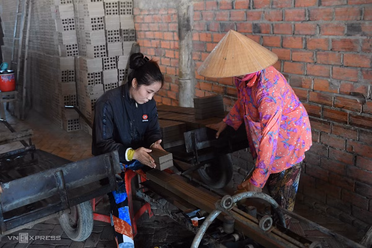 Mỗi lò có thể chứa khoảng 15.000 viên, nung trong 20 ngày thì ra thành phẩm. Công nhân dùng tro trấu để nung gạch giúp tiết kiệm chi phí, nguyên liệu.