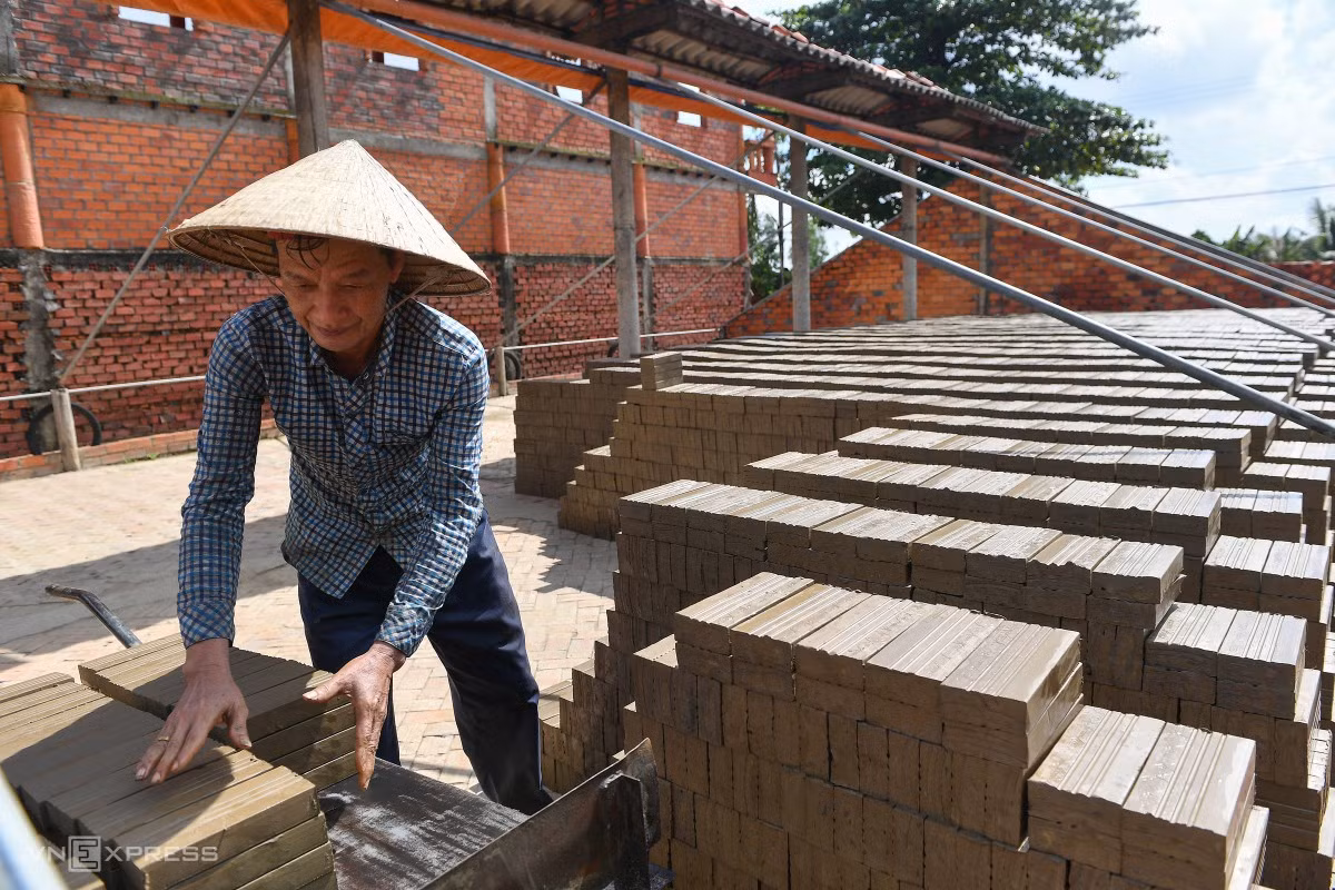 Ông Nguyễn Văn Theo, công nhân làm gạch ở kênh Thầy Cai, huyện Mang Thít đem những viên gạch vừa cắt xong ra ngoài phơi nắng. "Trước đây nơi này nhộn nhịp lắm giờ thưa thớt rồi", người đàn ông 60 tuổi, có 30 năm làm gạch cho biết.