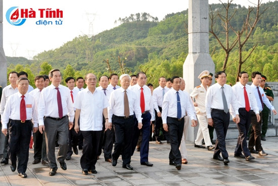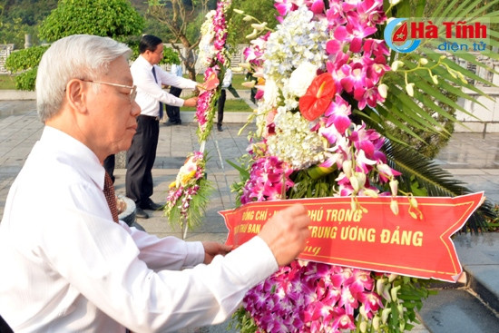 Trong không khí trang nghiêm, Tổng Bí thư Nguyễn Phú Trọng cùng các thành viên đoàn đã dâng hoa, thắp hương trước khu mộ Tổng Bí thư Hà Huy Tập, đồng thời bày tỏ lòng biết ơn vô hạn đối với công lao, đóng góp to lớn của Tổng Bí thư Hà Huy Tập cho sự nghiệp cách mạng vẻ vang của Đảng. Đoàn nguyện hứa sẽ không ngừng nỗ lực phấn đấu, phát huy truyền thống cách mạng của cha anh để xây dựng quê hương, đất nước ngày càng giàu mạnh, ấm no, hạnh phúc.