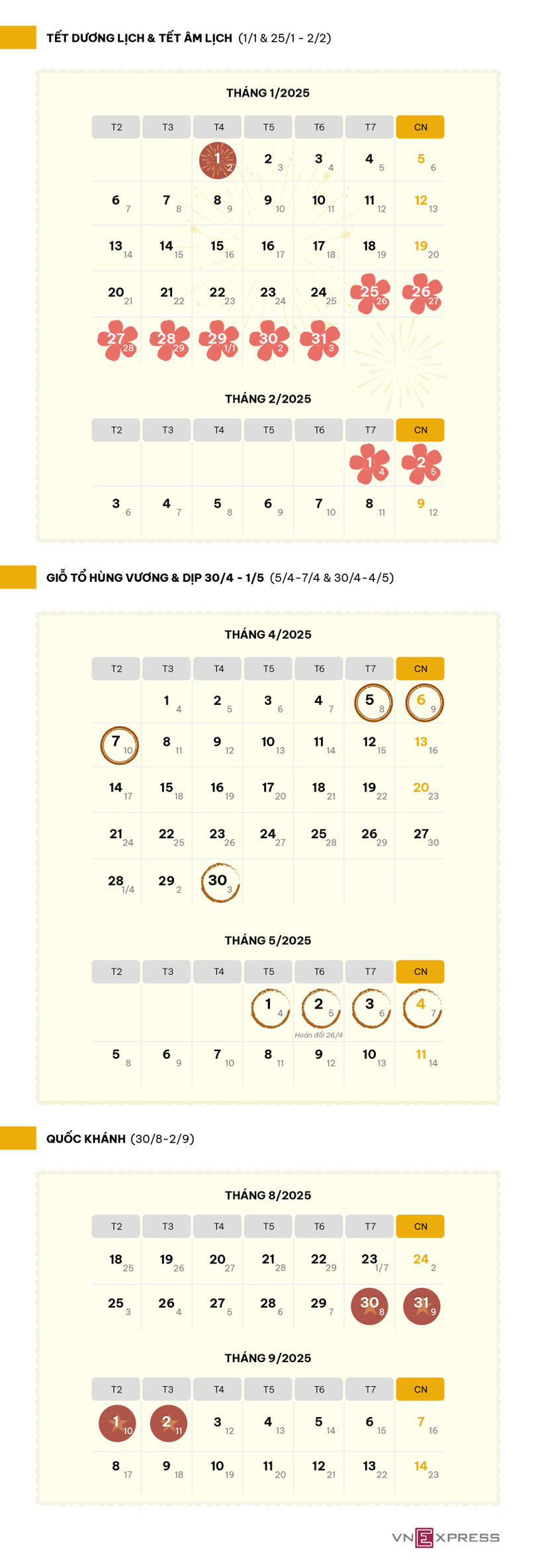 Năm 2025, người lao động được nghỉ tổng cộng 22 ngày dịp lễ Tết, gồm 11 ngày chính thức và 11 ngày nghỉ hàng tuần, hoán đổi.