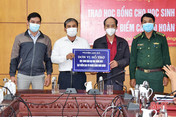 Để động viên các tân sinh viên có hoàn cảnh khó khăn, lãnh đạo huyện và các đơn vị tài trợ đã trao học bổng cho 5 em: Nguyễn Thị Lan Anh (thị trấn Lộc Hà), Phan Thị Phương (xã Tân Lộc), Lê Viết Hiếu, Bùi Thị Hà (xã Hồng Lộc); Lê Thị Phương Linh (xã Bình An). Các em được nhận học bổng mỗi tháng 1 triệu đồng, trong suốt các năm học đại học với điều kiện kết quả học tập hằng năm đạt loại khá trở lên.