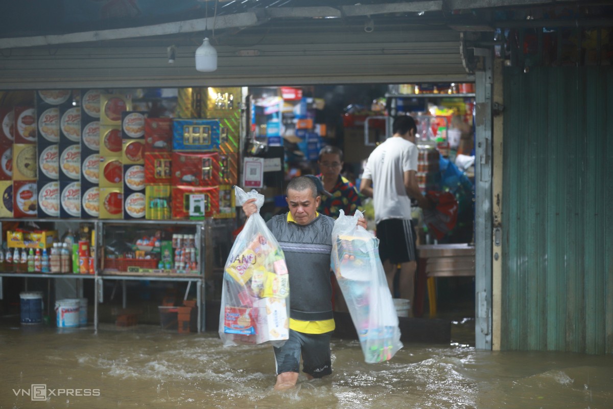Lo ngại nước lũ dâng cao, ngập lâu, người dân ở phường Thuận Hóa đi mua nhu yếu phẩm dự phòng.